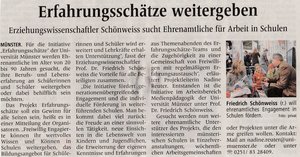 Das Erfahrungsschätze-Team hat in einer Befragung ermittelt, in welchen Bereichen Münsteraner Schulen sich zusätzliche Unterstützung wünschen. Besonders oft genannt wurden dabei von den Schulleitungen die Bereiche Mathe- und Sprachförderung, Nachhaltigkeit und Umwelt, Kunst und Musik. Studierende haben bereits zu den Themen Berufsorientierung, Rechtschreibförderung, Interkulturelles Lernen und Persönlichkeitsentwicklung praxistaugliche Konzepte erarbeitet, an denen weitergestrickt werden kann. Interessierte mit dazu passenden Kenntnissen oder dem Wunsch, sich in einem solchen Zusammenhang einzubringen, sind herzlich willkommen.