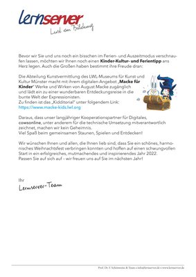 Wir möchten uns an dieser Stelle bei Ihnen bedanken: Für Ihr Engagement und Ihren unermüdlichen Einsatz für Kinder und Eltern, für all die schönen Rückmeldungen und Erfahrungsberichte – und dafür, dass Sie in diesen stürmischen Zeiten den Blick für das, was Bildung im Kern ausmacht, nicht verlieren. [Weiter im PDF...]