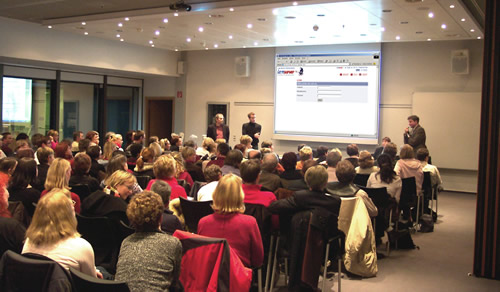 Überaus eindrucksvoll konnte man am Mittwoch im HNF das Vorurteil widerlegt sehen, wonach sich Lehrer viel zu wenig für ihre Schüler engagieren würden! 180 Lehrerinnen und Lehrer aus mehr als 70 Schulen des Kreises Paderborn wollten sich über ein Kooperations-Angebot informieren, das durch die Pisa-Studien besondere Aktualität erhalten hat. Das Kreismedienzentrum hatte alle Schulen der Region zu einer Auftaktveranstaltung eingeladen, bei der neue, computergestützte Möglichkeiten der individuellen Rechtschreib-Förderung vorgestellt wurden. Im Mittelpunkt der Veranstaltung stand der von Prof. Schönweiss und seinem Team an der Universität Münster entwickelte Lernserver, der auf dem Gebiet der Rechtschreibförderung offensichtlich den aktuellen Nerv der Lehrer trifft.